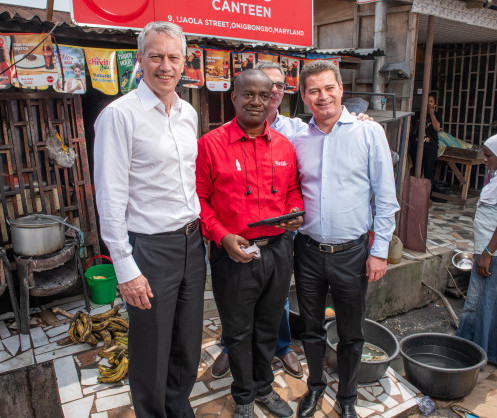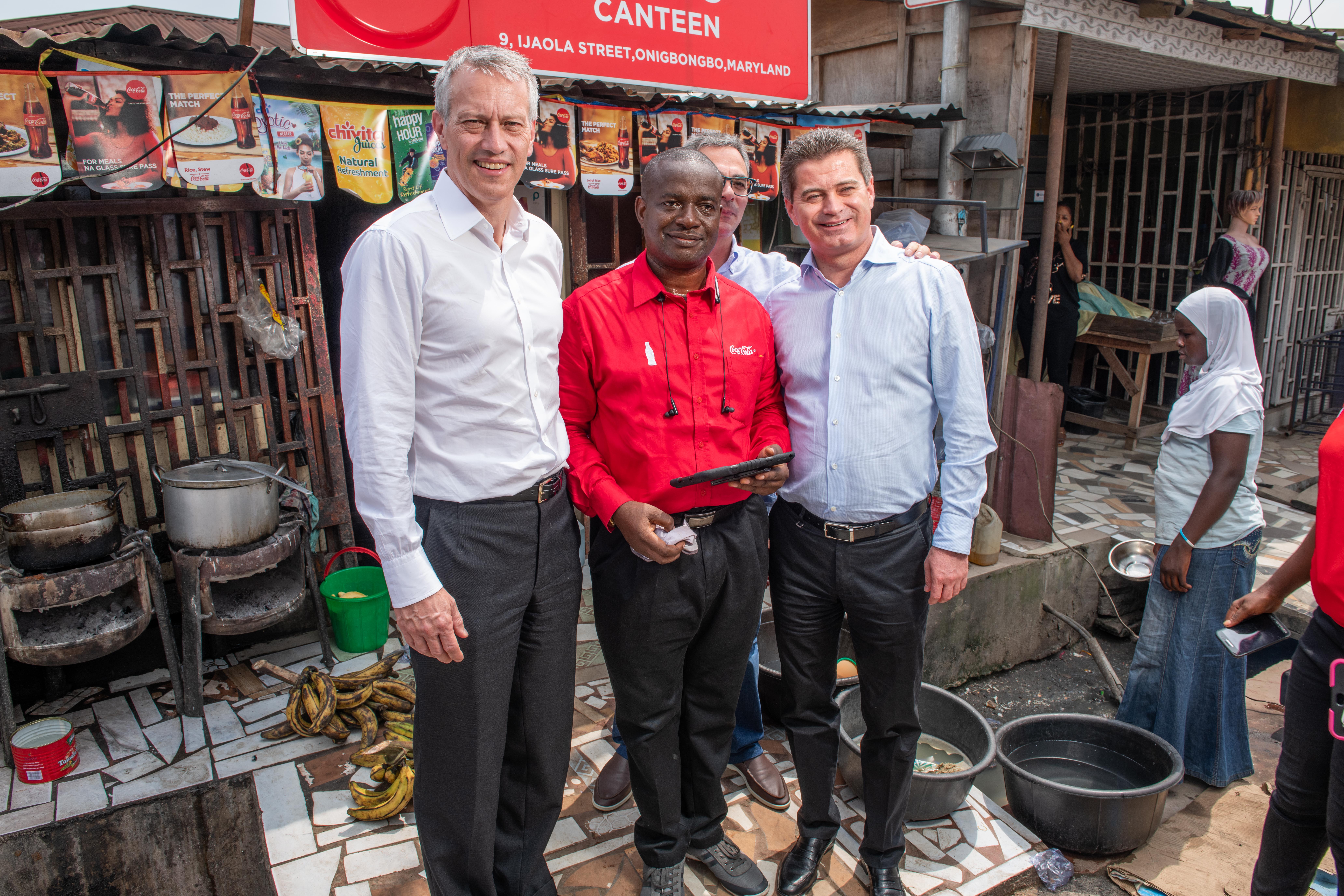 - James Quincey, président et chef de la direction de The Coca-Cola Company, représentant des ventes pour la Nigeria Bottling Company, et Zoran Bogdanovic, directeur général de Coca-Cola Hellenic, lors d'une visite de marché au Maryland de Lagos