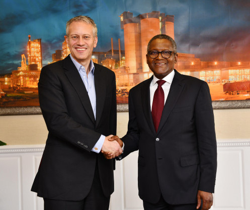 - James Quincey, président-directeur général de The Coca-Cola Company (à gauche) et Aliko Dangote, président du groupe Dangote, lors de leur récent engagement à Lagos