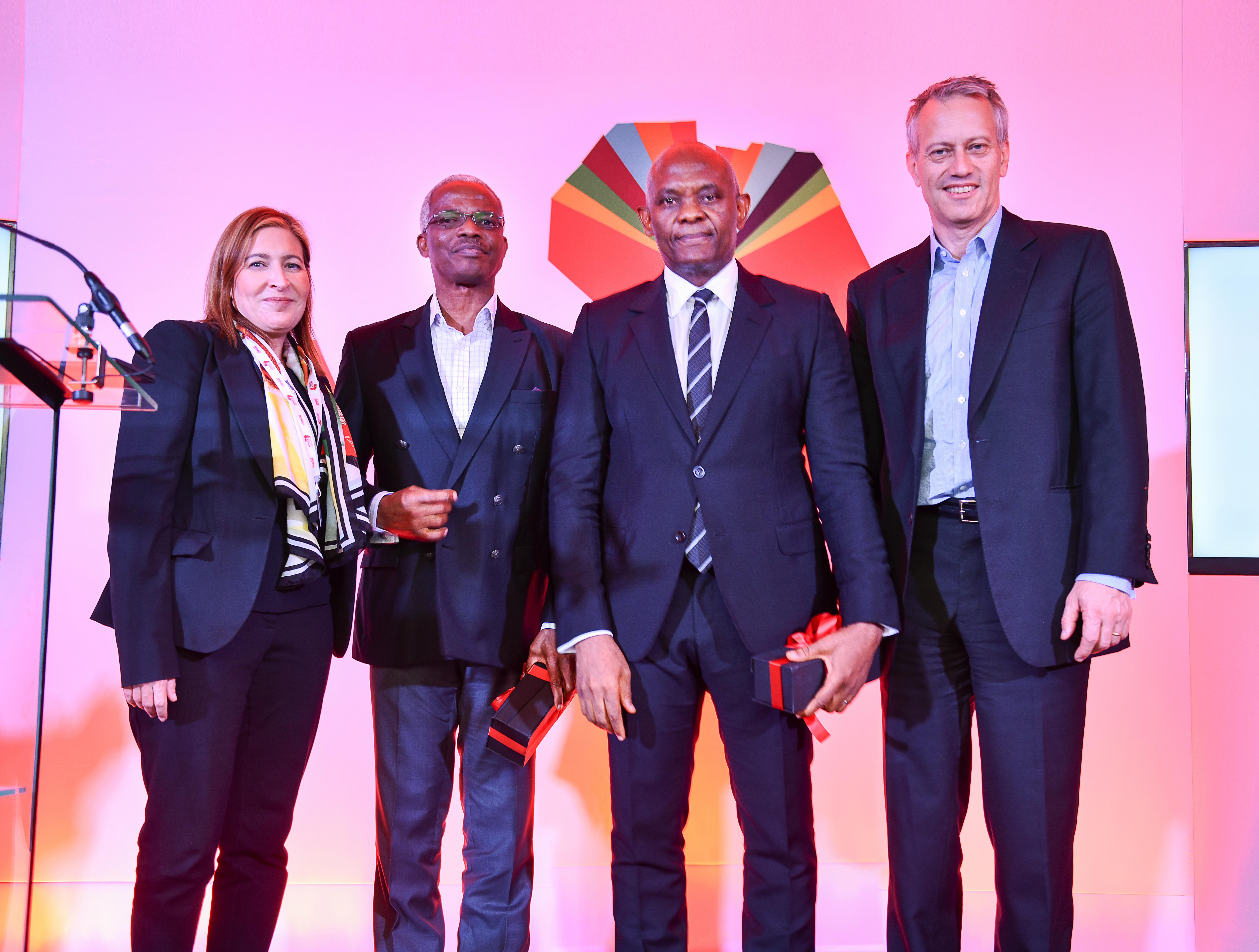 Bea Perez, Premier vice-président et chef des communications, agent des relations publiques et de la durabilité, Coca-Cola Company; Doyin Salami, président du conseil consultatif de l'économie (FRN); Tony Elumelu, président du conseil, Heirs Holdings et James Quincey, PDG (Source: Coca-Cola | 6 years ago) |
